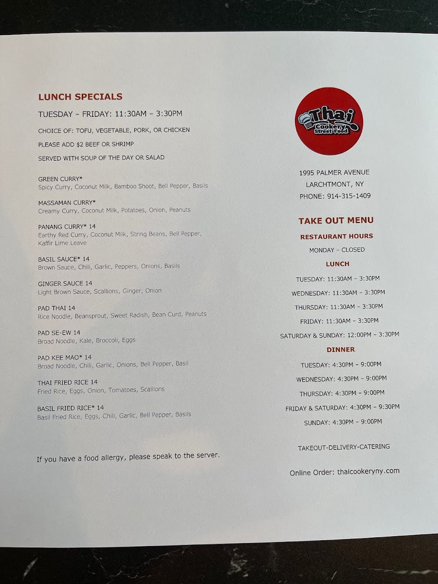 Thai Cookery Street Food NY Menu